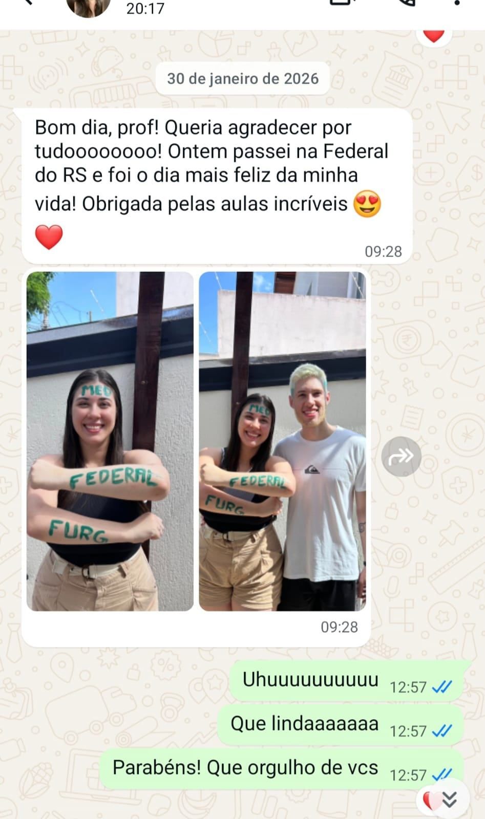 Ao longo da minha trajetória, já foram mais de 1.100 alunos aprovados, que conquistaram a tão sonhada vaga nas melhores universidades do país.